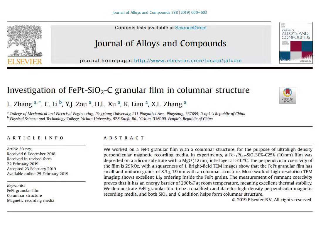 近日,bevictor伟德新进教师、大学物理教学中心主任章黎博士在欧洲Elsevier旗下的知名期刊《合金和化合物杂志》(Journal of Alloys and Compounds)上发表题为“Investigation of FePt-SiO2-C Granular Film in Columnar Structure”的科技论文。《合金和化合物杂志》为SCI二区科技期刊(最新影响因子3.779),在全球材料科学领域有着重要的影响。章黎博士的论文阐述了FePt纳米材料作为下一代电脑硬盘存储媒质性能的优越性,是公司教师开展应用技术研究的又一重要成果。