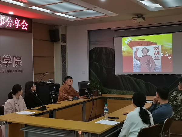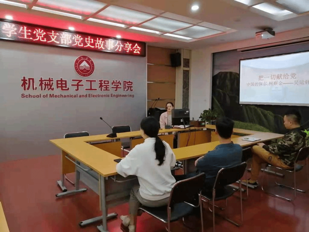 会上杨芳老师、黄鸥老师陆玉锋、吴俊和张剑敏同学给全体党员做了党史故事分享。