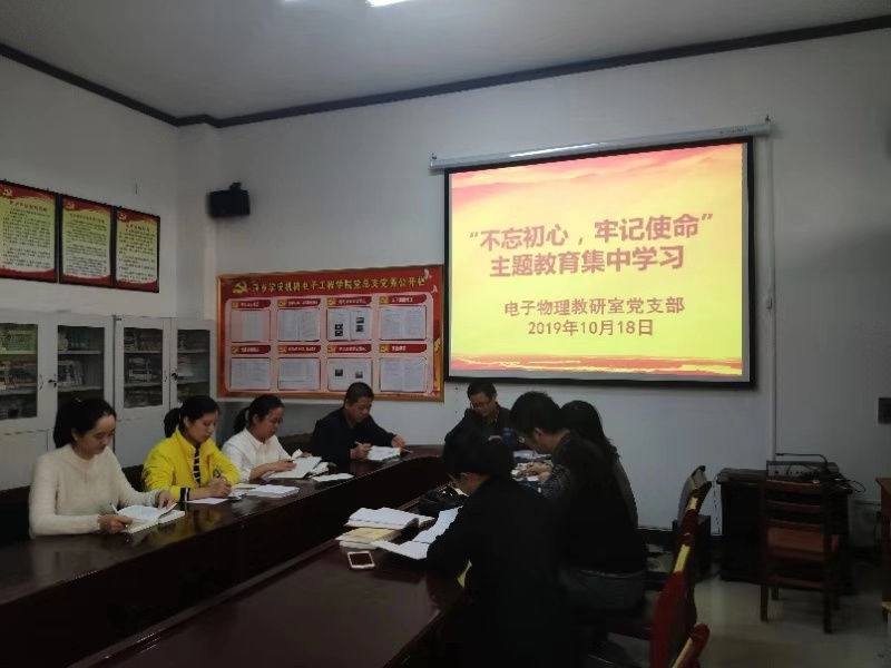10月18日,bevictor伟德电子物理教研室党支部全体党员在2216教室开展“不忘初心,牢记使命”主题教育活动,活动由党支部书记李伯勋主持。此次活动中,大家集体学习了习近平总书记对江西工作重要讲话金句,学习了习近平总书记在“不忘初心,牢记使命”主题教育会议上的讲话内容,深刻领会了此次讲话的目标要求和精神内涵。