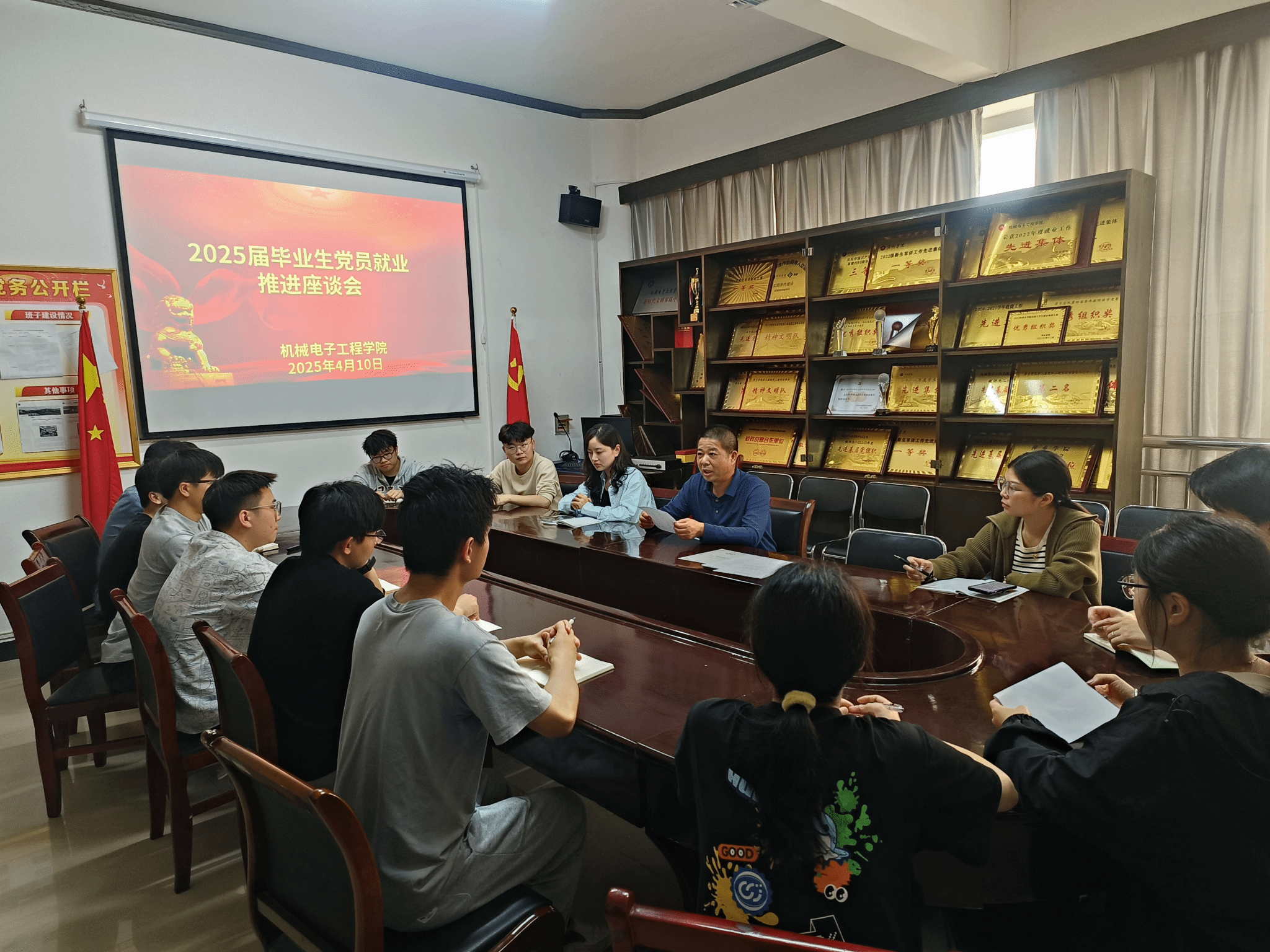王斌书记首先强调了毕业班党员在就业工作中的重要作用。他指出,党员同学应该树立正确的就业观念,将个人理想与国家和社会需求紧密结合起来,积极投身基层岗位和艰苦行业,凝聚集体力量,在基层建设、行业发展等领域勇担责任。在政策宣传方面,王书记要求党员要深入学习国家和地方的就业方针政策,成为政策的“明白人”,并通过班级群、宿舍交流等多种渠道向同学们宣传这些政策,提高大家对政策的知晓率和利用率。在拓宽求职渠道方面,王书记鼓励党员同学除了关注传统的校园招聘和网络招聘平台外,还要关注社交媒体上的招聘信息、专业人才推荐网站等。他还强调了党员同学要积极下寝室去分享自己在不同渠道求职的经历和收获,鼓励同学们勇敢尝试新的求职方式,增加就业机会。