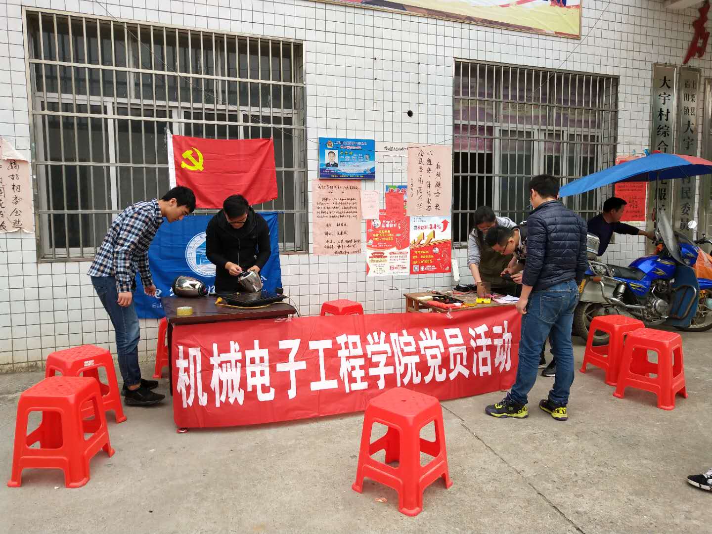 2018年3月30日,一支由教工、员工党员及入党积极分子组成的家电义务维修小分队,在公司党总支的带领下来到了上栗县福田镇大宇村,开展了下乡志愿服务主题党日活动。此次活动旨在发扬机电公司 “团结务实,学以致用”的宗旨,利用专业优势,开展义务维修活动。