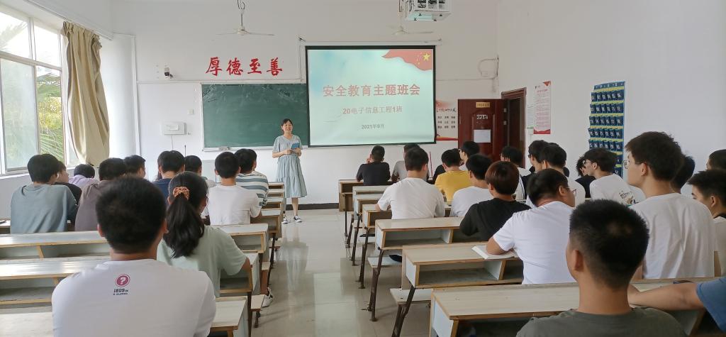 为增强同学们的安全防范意识,提高同学们的安全防范能力,以及给刚开学的同学们规划一下未来的学习计划。2021年9月9日下午,20级电子信息工程一班在鼎新楼2216开展安全教育主题班会,班会由辅导员罗钦艳老师主持。