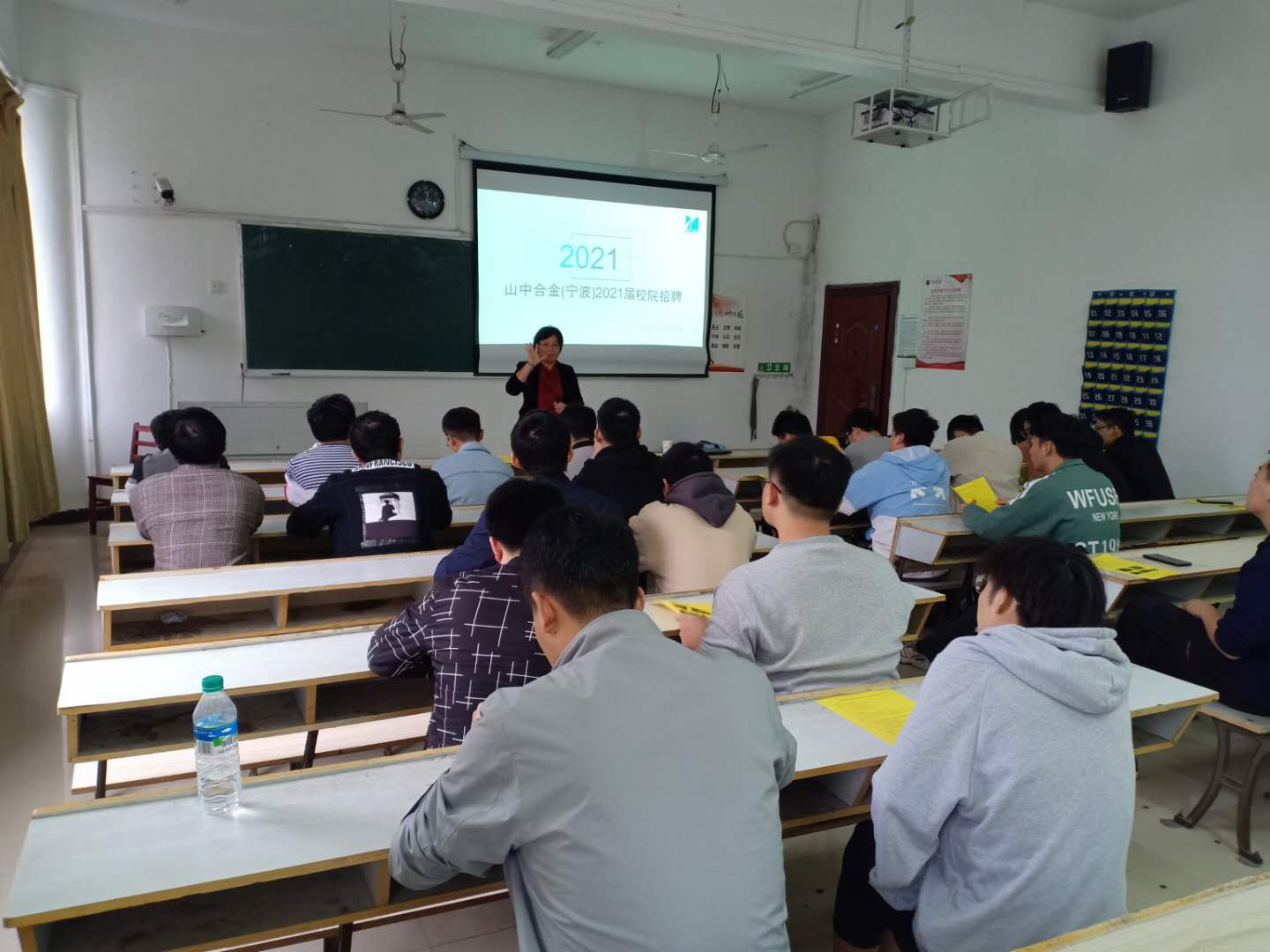 2020年10月20日下午,机电公司于2216教室召开山中合金(宁波)有限公司专场招聘会,2021届机械设计制造及其自动化、机械电子工程专业毕业生参加了招聘会。该公司的副总经理李静给员工进行宣讲。