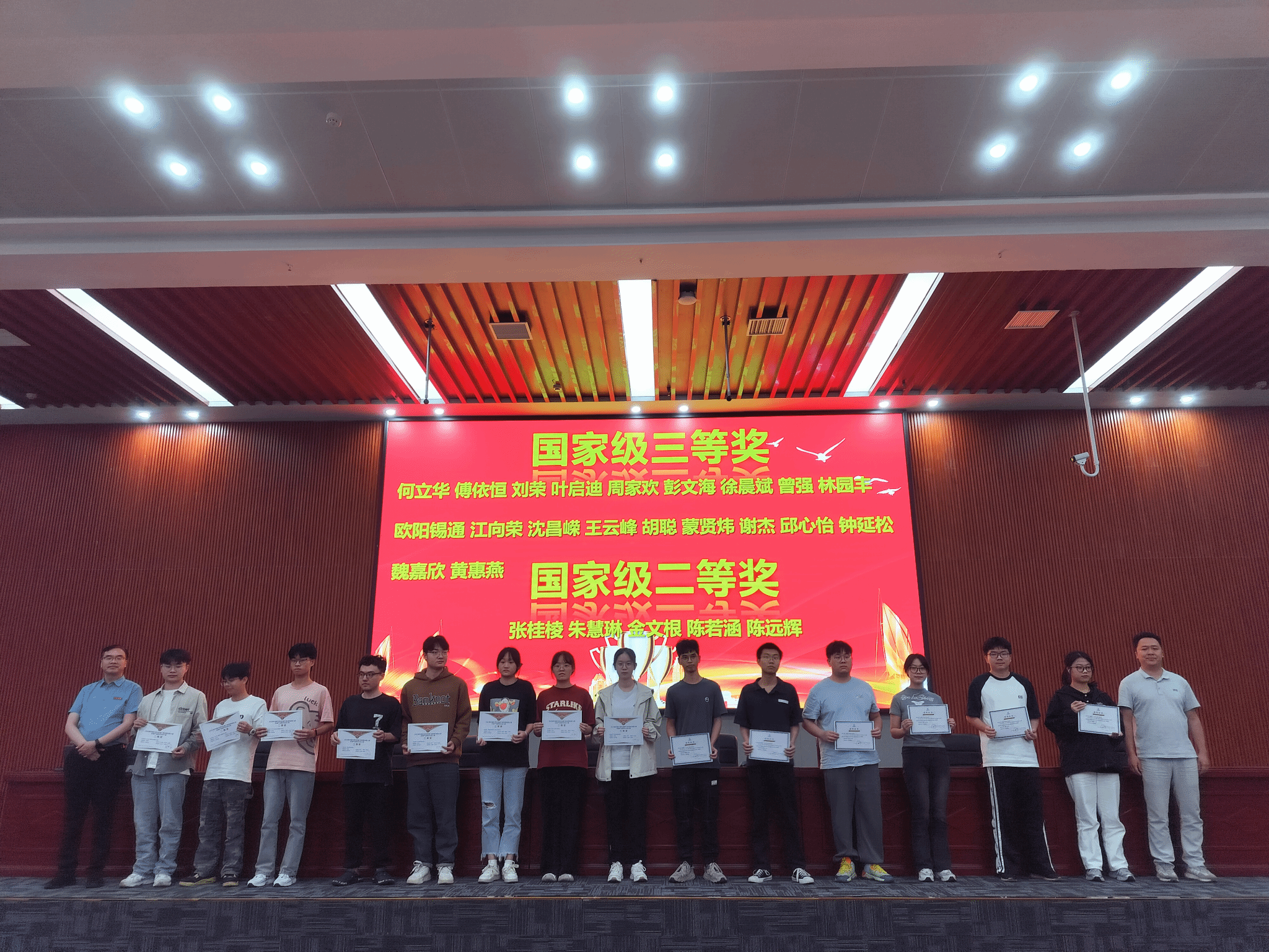 随后,各大赛指导教师依次给同学们详细地介绍了各类学科竞赛情况,鼓励大家积极参加学科竞赛并努力备战。公司党委副书记童乐宣读了关于表彰2023年度科技创新竞赛获奖选手的决定,与会领导为获奖员工代表进行了颁奖并合影。