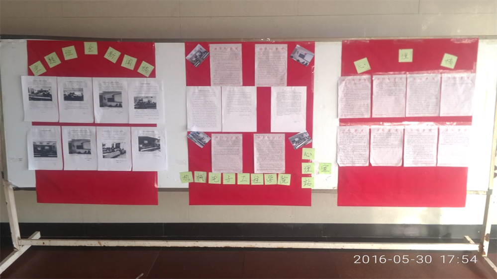 在这些活动进行的期间,我们机电公司同时准备着图文展活动,经过审核,选出了一些优秀的心理主体活动的新闻报道,活动照片,心理稿件,经过系站成员的努力,已将5.25活动月的稿件照片等粘贴在展板上用以展示。