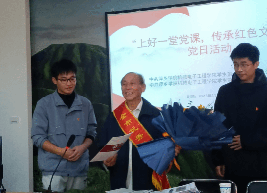 活动首先,同学们对江福星爷爷的到来表示了热烈的欢迎,预备党员罗鑫坤向江福星同志送上了机电公司员工党支部自制的印有支部介绍与支部荣誉的纪念卡片,预备党员万乐峰向江福星同志送上了花束。
