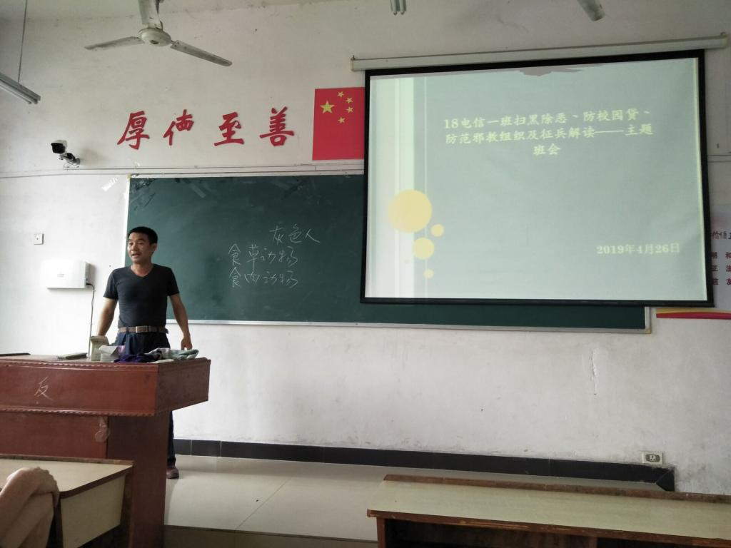 为打击校园黑恶势力,构建良好有序的和谐校园,18电信1班于4月26日下午在鼎新楼2314举行扫黑除恶主题宣讲活动。宣讲由机电公司经理苏啸主讲。