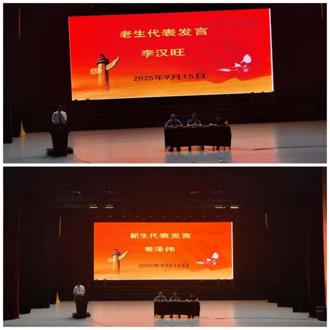 在校生代表2023级机械设计制造及其自动化专业李汉旺向学弟学妹们分享了关于个人成长的思考,他鼓励同学们积极进取,不畏失败,坚定前行,以最昂扬的姿态拥抱即将开启的老员工活。2025级新生代表常泽伟表达了要在新学年新学期踔厉奋发、笃行不怠,展现出新生群体锐意进取的精神风貌。
