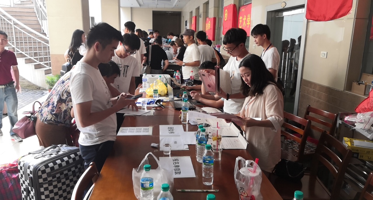 今天整个的迎新工作总体情况较好,出现了新生集中报到的一个小高潮。省内新生报到率比较高,新生和家长对迎新工作普遍感到满意。