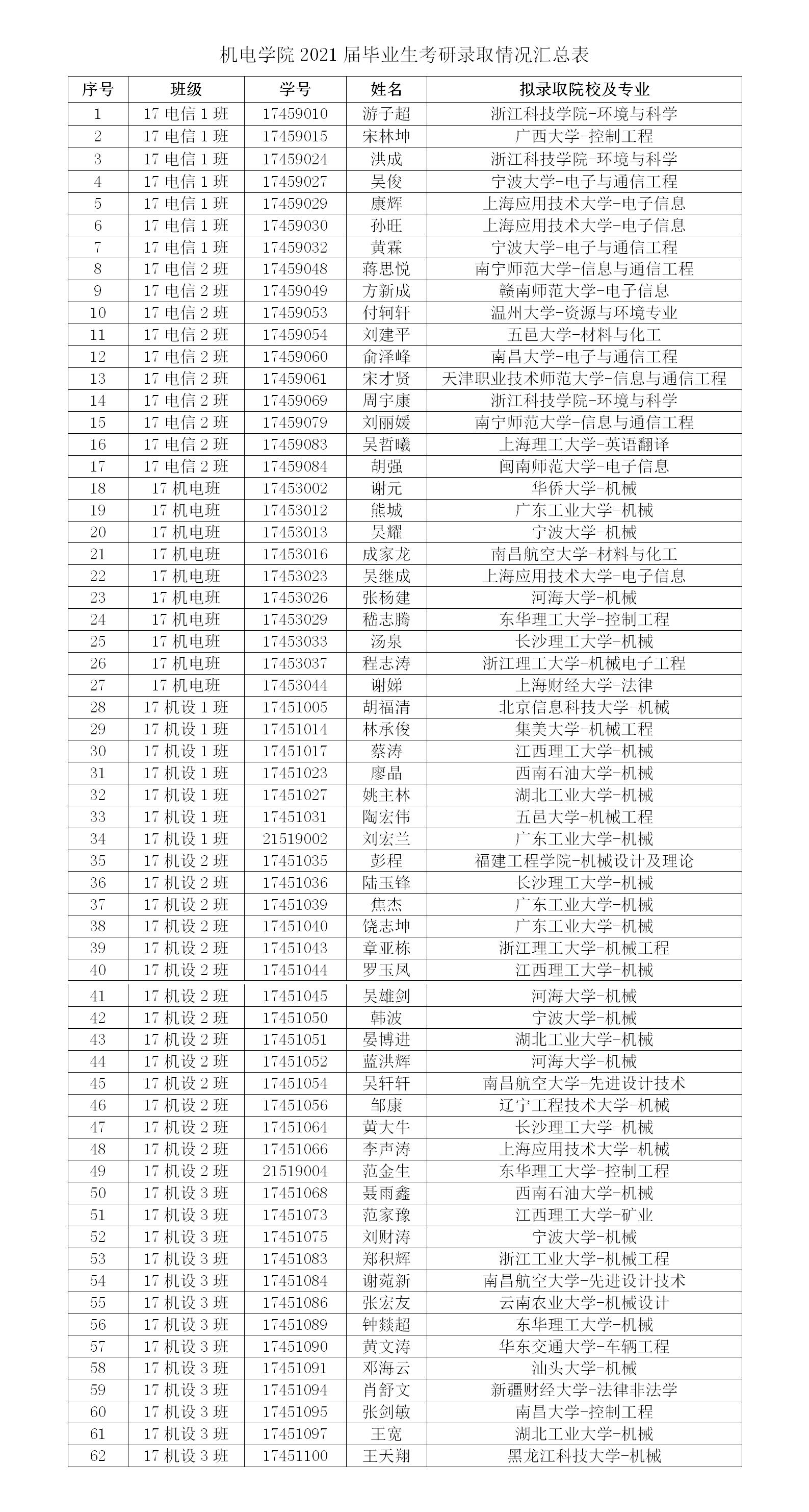近期,随着全国各高校研究生拟录取结果的陆续公布,机电公司2021届毕业生考研战果捷报频传,现已有62名员工被录取为硕士研究生。今年的考研战果,不管是在考研录取的人数还是录取的质量上,都创造了近几年的最好成绩。据统计,公司2021届本科毕业生共242人,其中有98人参加了研究生考试,有67人过了国家线,现已有62人被录取,录取的公司不乏有上海财经大学、广西大学、南昌大学、河海大学等211院校。