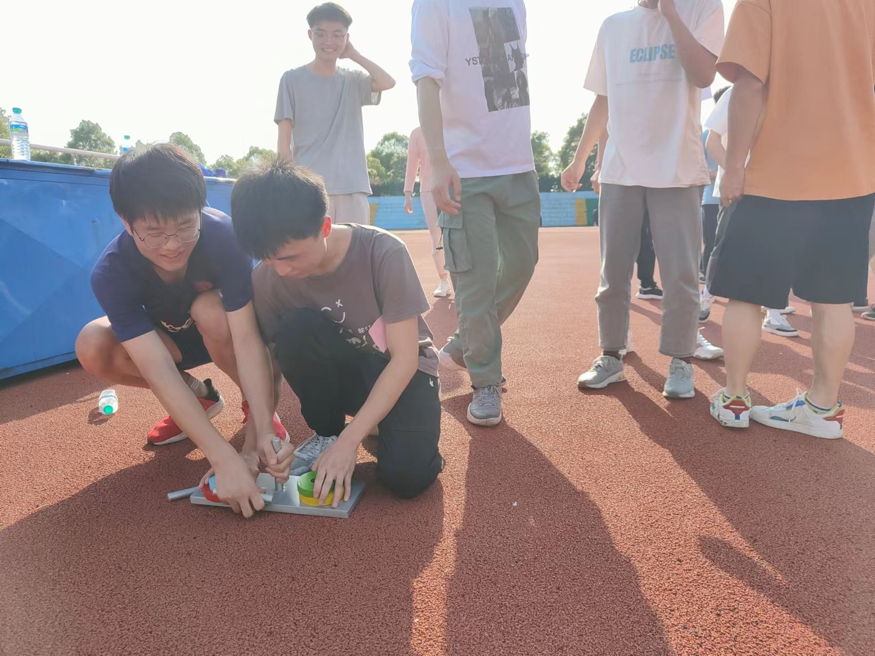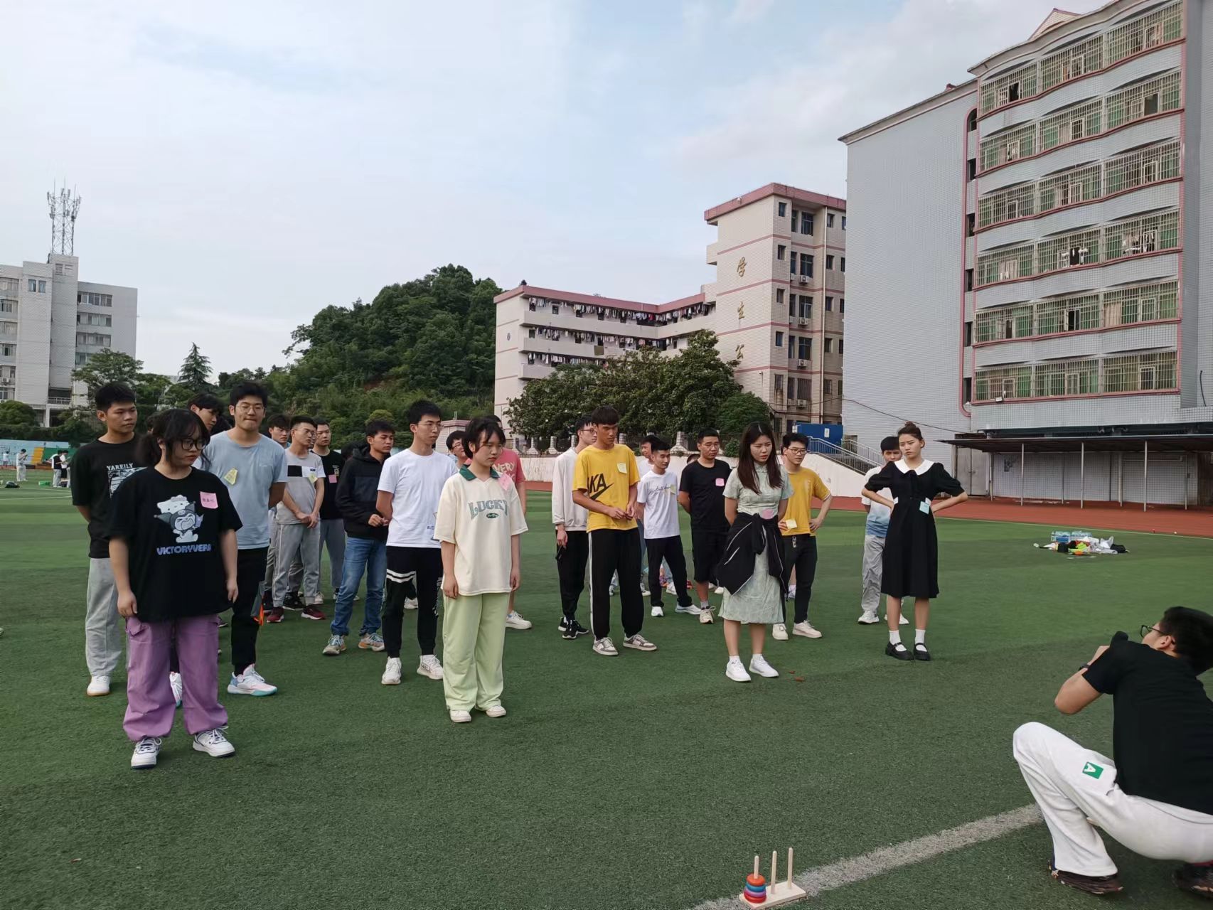 在素质拓展活动中,各个班级组织利用课余时在操场进行户外拓展训练以及团队合作游戏。通过这些活动,新生们互相认识、加深了解,培养了相互合作、相互信任的意识。
