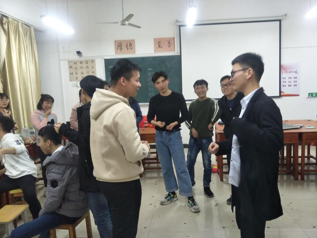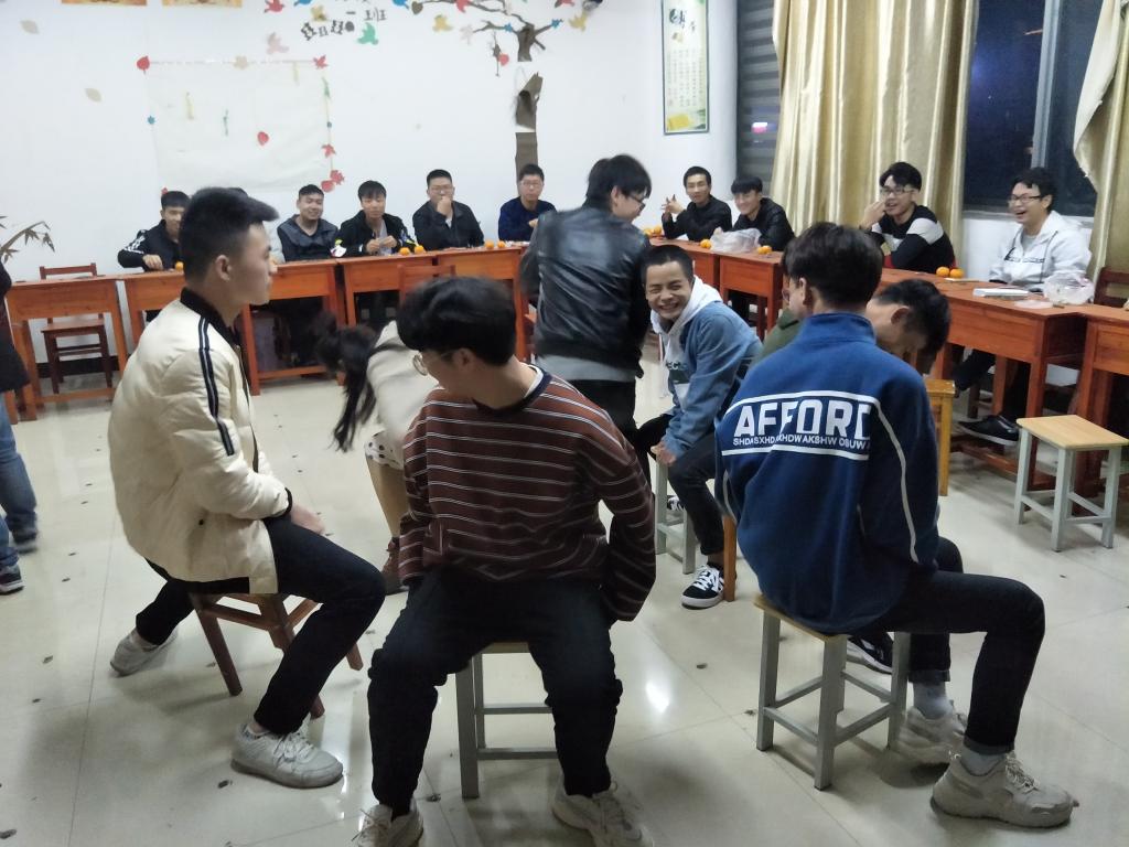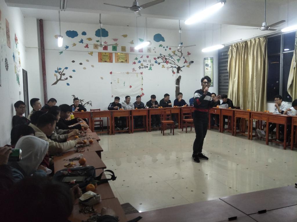 此次活动由班长任志博主持,首先,利用上午的空闲时间一起去校外购买零食,水果以及奖品。接着我们将零食带到2214,在下午六点半班委在鼎新楼2214集合。进行教室布置、调试音响、张贴团旗、零食和水果分配。晚上七点从准时开始。首先,副班长许芙蓉播放班级暖场视频。接着开始个人才艺展示环节班级成员许新胜、朱梁波分别清唱了沙漠骆驼、38度6。接下来便是游戏环节,游戏分别是抢凳子、你来比划我来猜、五毛一块。主持人宣布交流会结束,班长进行活动总结。最后,全体成员合影留念。留影后17电信一班全体人员打扫卫生,把自己产生的垃圾带走,把桌子凳子还原。
