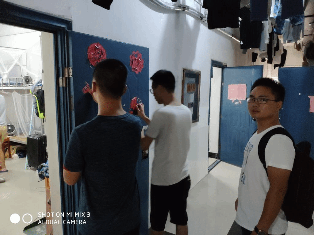 班主任来到寝室时,19级机电二班的几个寝室正在进行卫生大扫除,欧阳老师仔细的地检查每一个卫生死角,灰尘满满的浴室出风口、花洒顶部、窗台、衣柜、电线盒等,并对墙上乱贴乱挂现象提出了改进措施,在班主任的督促下,员工积极打扫,宿舍焕然一新。