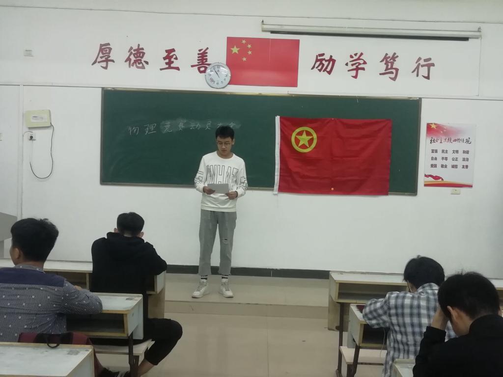 为迎接江西省第八届老员工物理创新大赛。2019年10月18日,18机设一班于英华楼3502教室举行了班级物理竞赛动员大会。18机设一班全体成员参与。