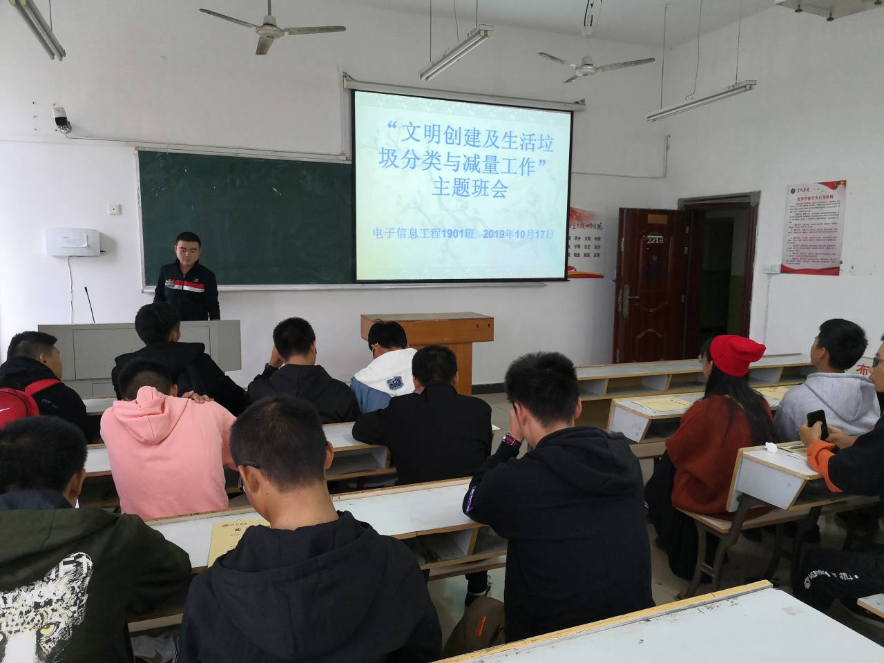 2019年10月17日,电子信息工程1901班在2216举行了“文明创建生活及垃圾分类与减量工作”主题班会。全体员工参加班会,会议由班主任胡子健老师主持。