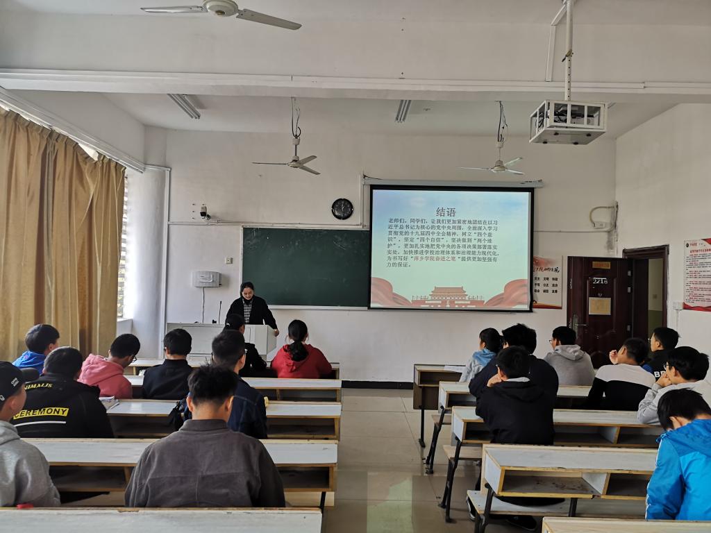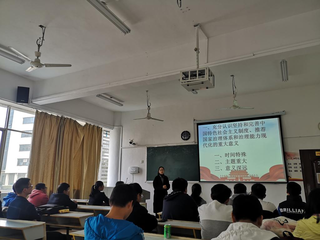 为进一步学习宣传贯彻党的十九届四中全会精神,帮助广大师生树牢“四个意识”,坚定“四个自信”,坚决做到“两个维护”,根据公司统一安排,12月16日中午,机电公司在2216教师开展专题培训会,为“宣讲团”成员宣讲党的十九届四中全会精神。本次宣讲会由辅导员杨芳老师主持,18、19级各班班长、员工会各部门部长到场参加。
