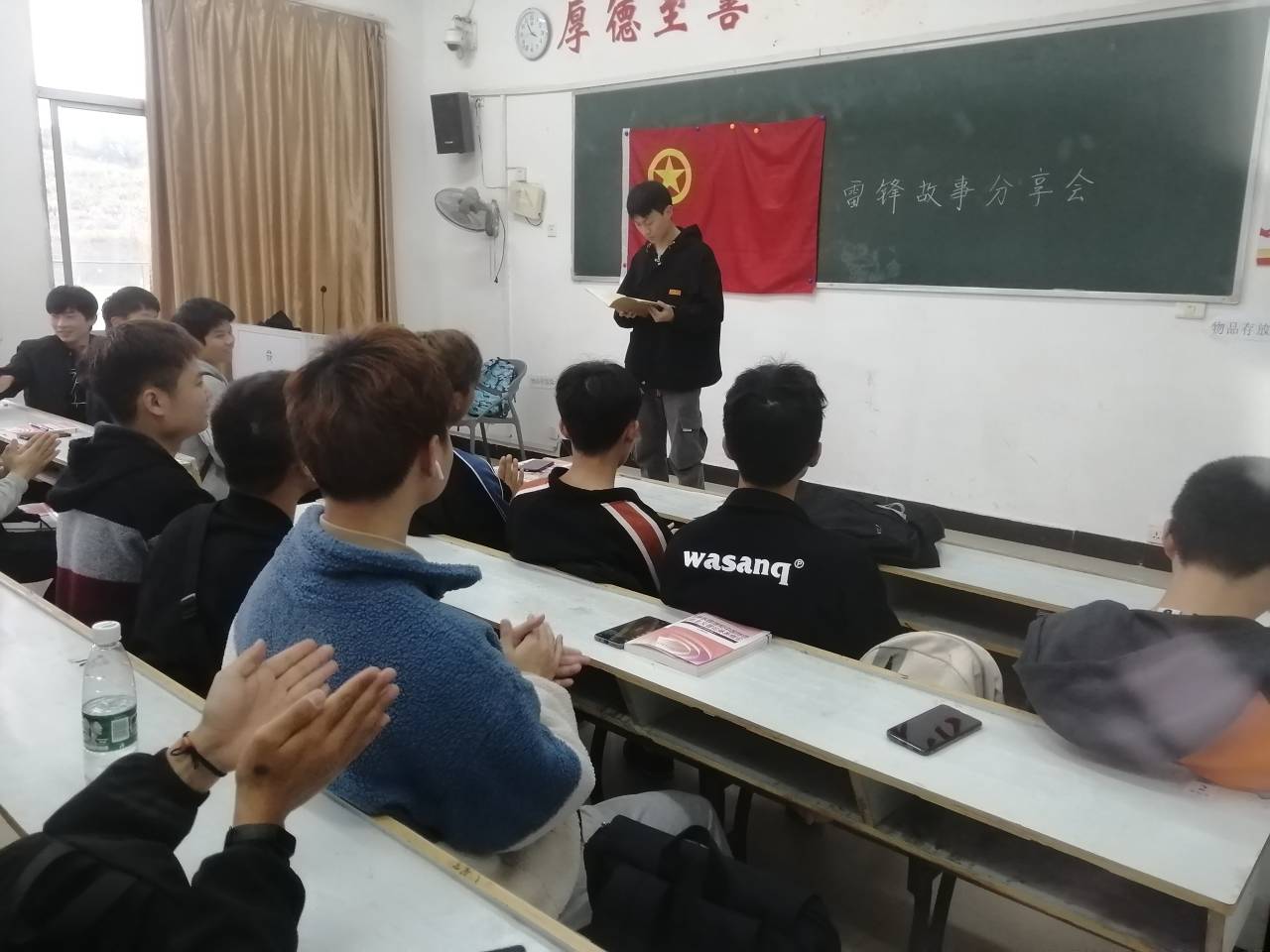 活动在赞颂雷锋精神的《学习雷锋好榜样》歌曲中拉开了帷幕。随后,班长从雷锋生平简介、雷锋的工作生活、雷锋的感人事迹、雷锋的精神几个方面进行了故事分享,大屏幕上循环播放了许多雷锋生前的照片,反映了雷锋做的种种好事。然后详细介绍了雷锋的感人事迹,并与班级同学亲切互动,气氛达到高潮。分享会上,同学们分享他们所了解的雷锋故事,比如沈阳火车站助人、雨夜送大嫂、钉子精神,充分展现出“雷锋出差一千里,好事做了一火车”。
